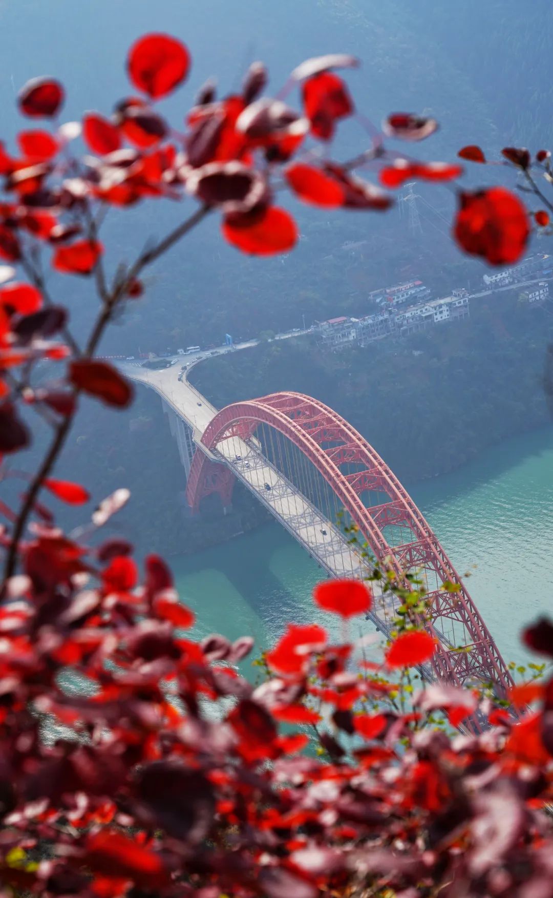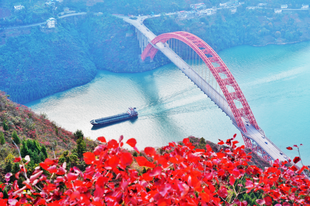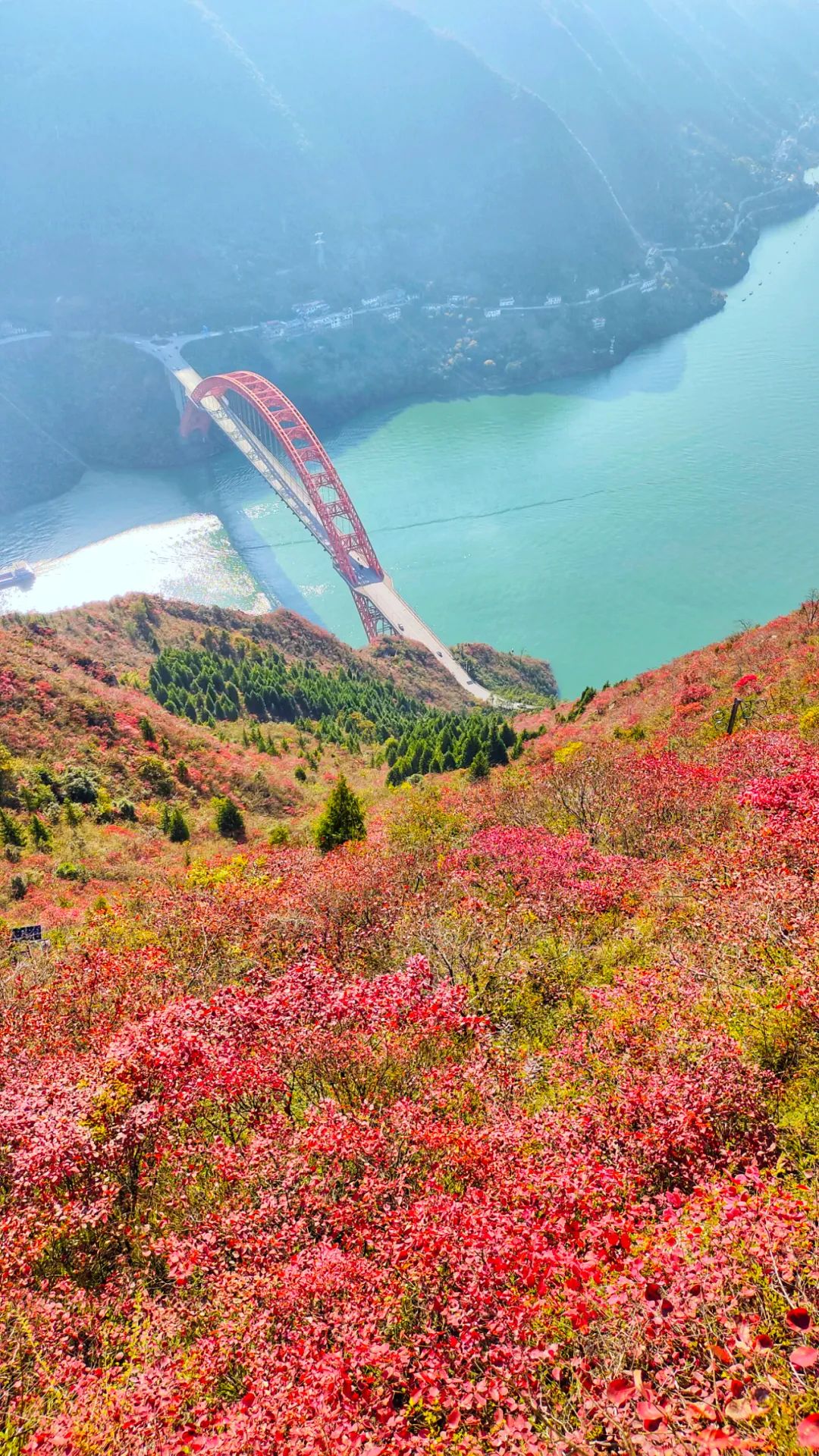 透过似火的红叶,俯瞰巫峡口彩虹卧波,“一桥飞架南北,天堑变通途”。远眺巫山县城依山层叠,江与城风情如画,让人顿生江山豪情。晚上入住巫山。