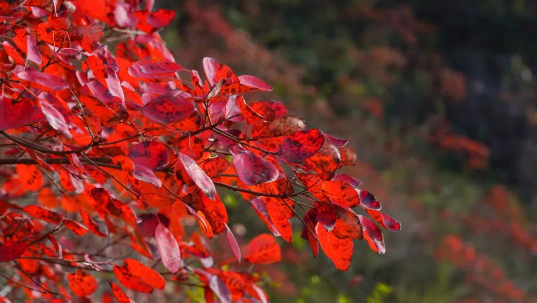 红叶坡大多是黄栌树,深秋的黄栌叶子圆圆的、红红的,像一颗颗花瓣一样。每棵树上都开满了“红花”,且只见“红花”不见绿叶,连成片就像漫天彩霞令人心动。