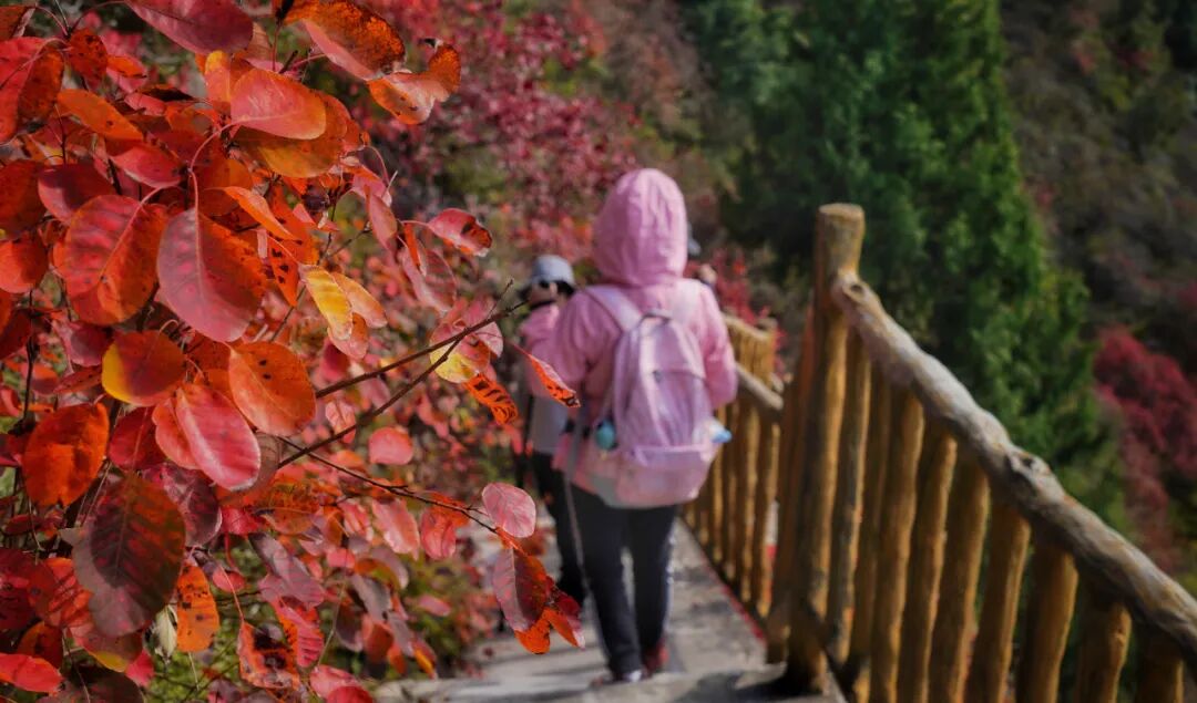 文峰观红叶随着山脊线分布,高大挺拔的黄栌红叶火红似火,怪石林立夹杂其中,置身其中与它零距离接触。