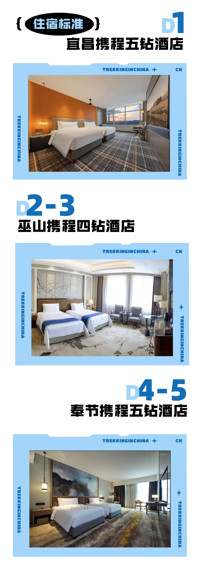 2. 住宿:全程 5 晚酒店标间,均为当地最好标准:含 1 晚宜昌携程五钻酒店、2 晚巫山携程四钻酒店、2 晚奉节携程五钻酒店;