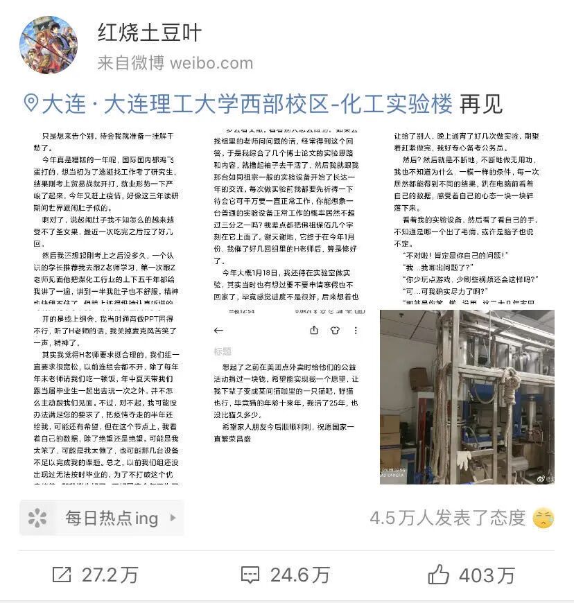 10月13号,大连理工一名研三的学生,以自杀的方式结束了自己年仅25岁的生命。