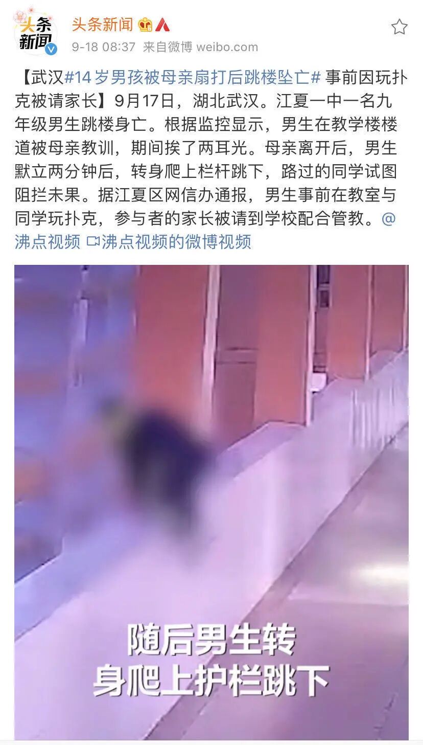 就在一个月前,9月18日,武汉的一名中学男生,因为在学校打扑克被老师请了家长。在被妈妈扇了两耳光以后,他翻身从五楼跃下,当场身亡。