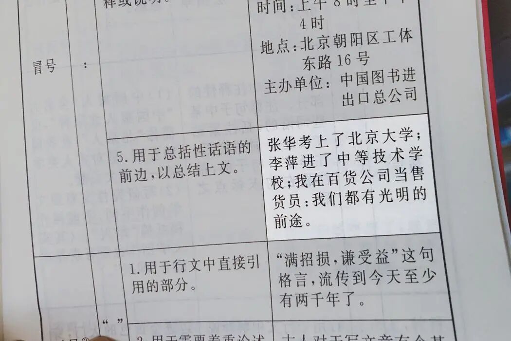 在1990年出版的《标点符号使用法》里有一个例句:“张华考上了北京大学;李萍进了中等技术学校;我在百货公司当售货员:我们都有光明的前途。”