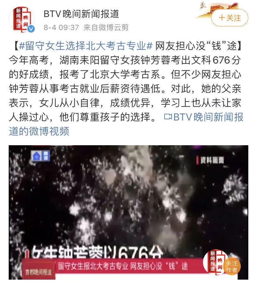 今年,我的湖南老乡钟芳蓉高分考入北京大学,却因为报考了考古专业连续上了好几天热搜。很多网友担心她读这个专业以后“没钱途”。有人甚至刻薄地说:寒门子弟不配追求什么爱好,不想着改善家庭条件就是自私。