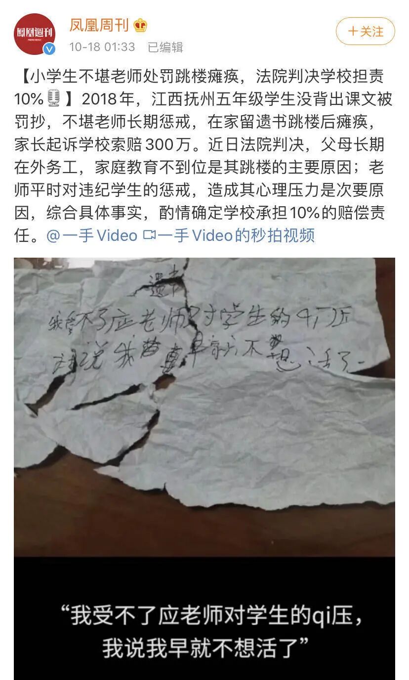 10月18日,又一个类似新闻上了头条。江西一名小学五年级女生,在被老师罚抄课文以后跳楼,所幸没有死,却造成终身瘫痪,家长向学校索赔300万。