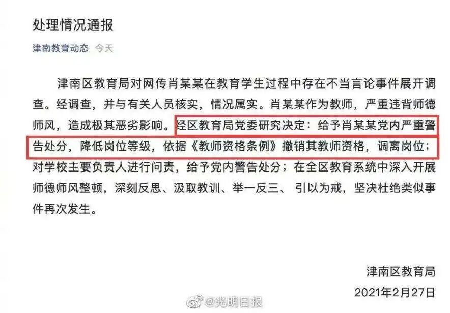 所以最后她得到了取消教师资格证、调离教师岗位的处罚,我认为是公正的。