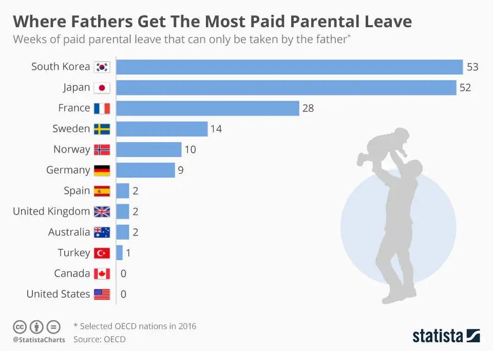 这么一比,韩国日本路子够野,竟给爸爸们超过一年的带薪育儿假,跟他们逐年降低的生育率正好相反,可见真是着急了。