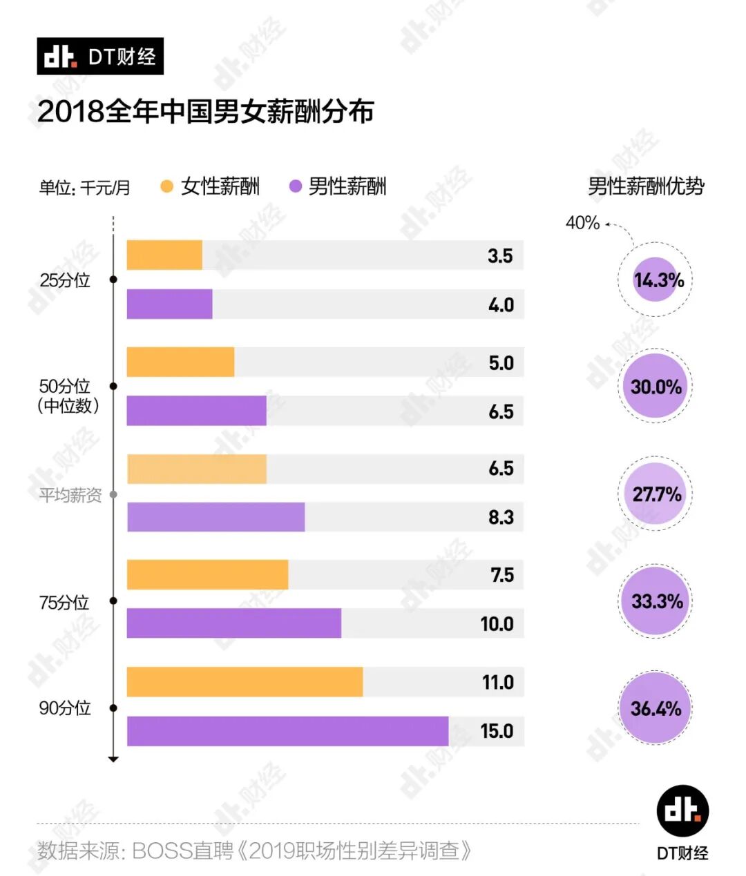 据DT财经统计数据,国内2018年男女平均收入差距高达27.7%。