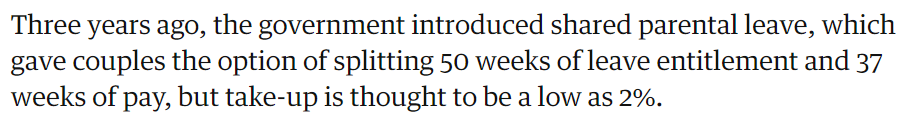 据《卫报》报道,这个政策实施以后,真正共享了育儿假的男性只有可怜兮兮的2%。