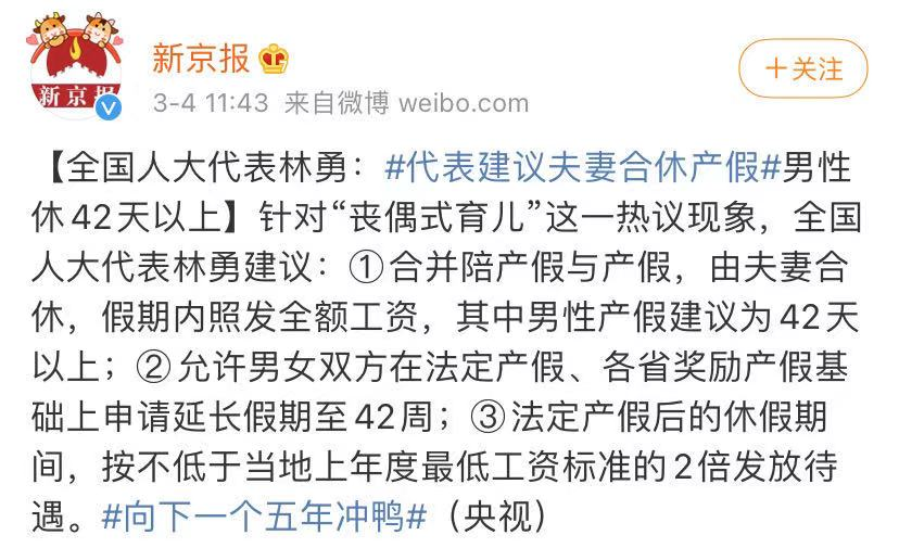 前几天我又看见一位人大代表提议“夫妻合休产假,男性休42天以上。”