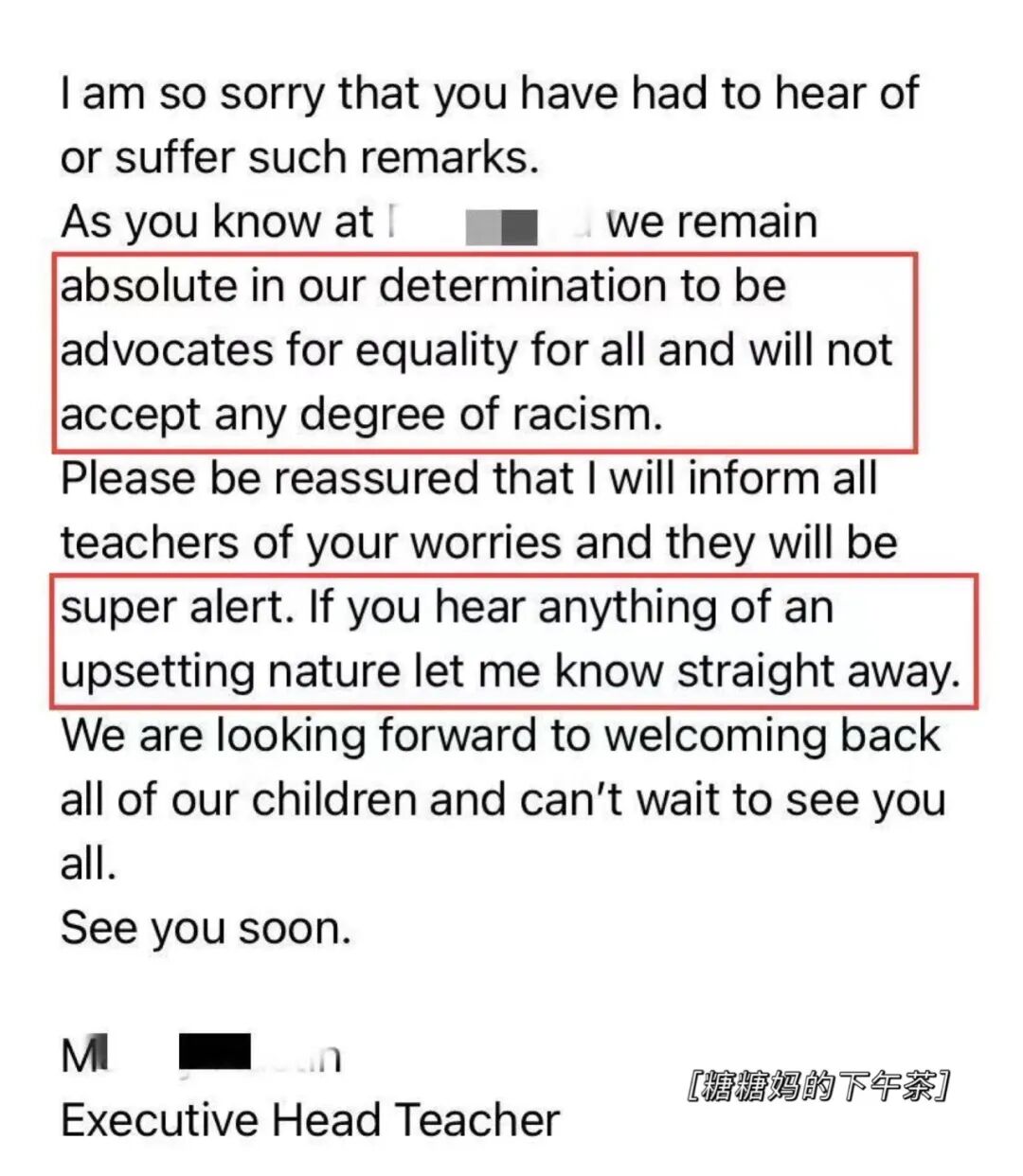 在校长的长篇邮件回复里,她措辞强烈地强调了学校“绝对不会容忍任何形式的种族歧视”并会让所有老师保持“高度警惕”,也建议家长如果发现任何迹象都可以“直接跟校长沟通”。