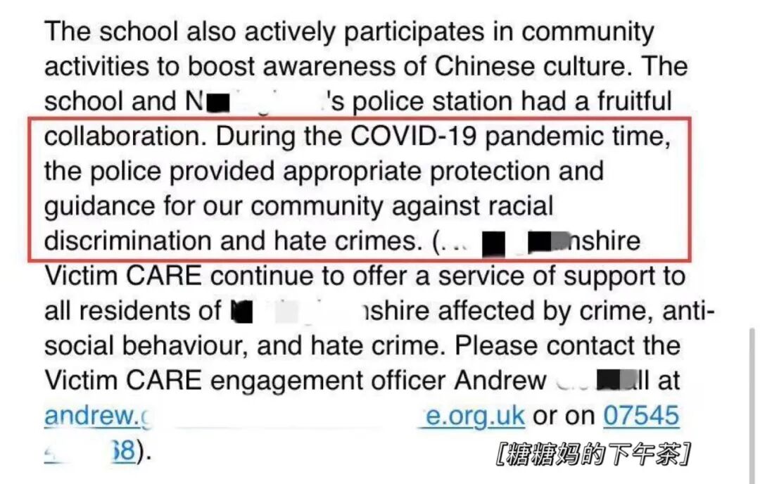 糖糖周六的中文学校(民间组织)里,也有当地警察三番五次去跟家长宣传,如果受到任何形式的种族歧视,一定要毫不犹豫地报警,并指派了专门的警员负责协调相关工作。