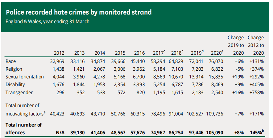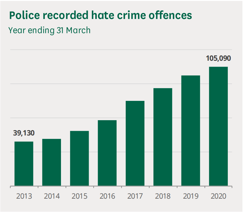 英国这些年的hate crime仇恨犯罪呈逐年上升状,政府官方公布的数据可以清楚地看到这个趋势。