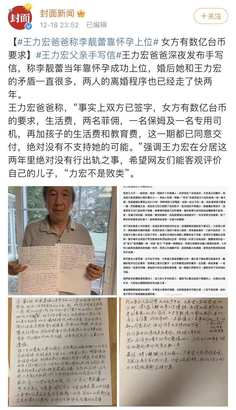 王某人在娱乐圈浸淫20年,被锤的时候想到的居然是拉老父亲出来擦屁股?看小图难道不更像是80岁老父给45岁儿子水滴筹吗?