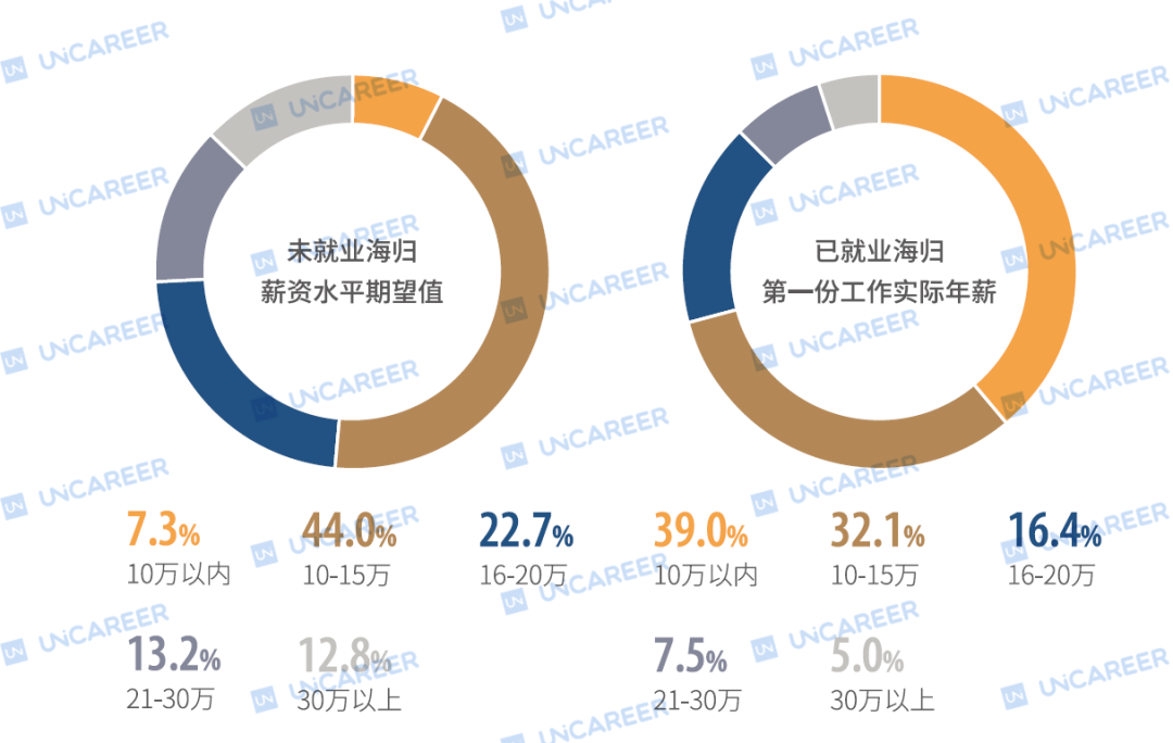 其中12.8%的海归认为自己应该拿到30万以上年薪,而真正拿到这一数字的仅占5%;有接近四成海归的实际年薪不足10万,这一比例相较19年增加了足足一成。