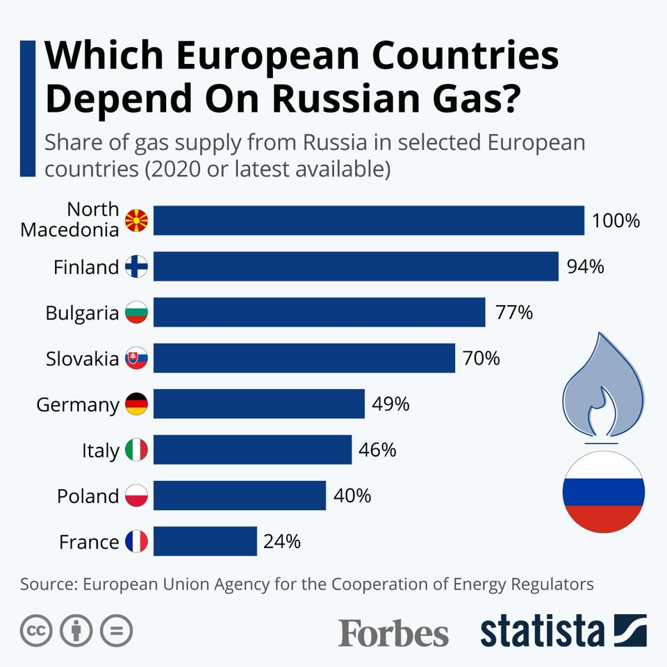 就拿一向经济强势的德国来说吧,竟也有49%的天然气是要从俄罗斯进口的。