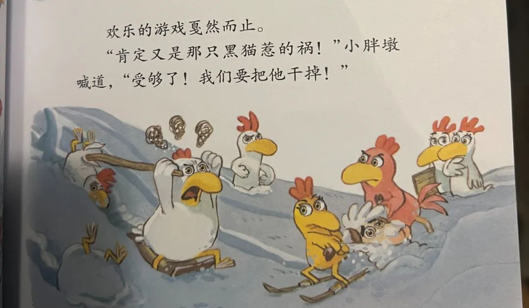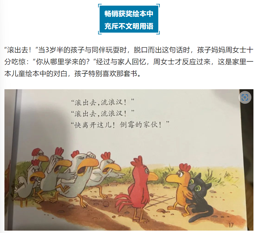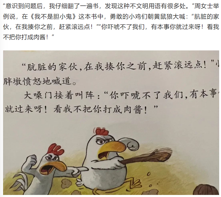 周女士认为,书中甚至还有“受够了!我们要把他干掉!”这种表达,对语言敏感期的孩子很不妥当。