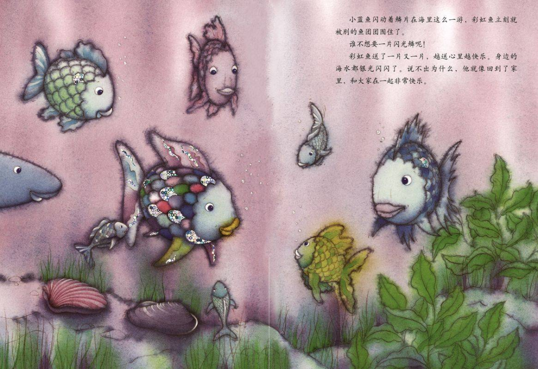 后来彩虹鱼想通了“独自美丽没人欣赏”,就把鳞片一片片拔下来送给大家,最后所有鱼都有了彩虹鳞片,大家都开心地一起玩耍。