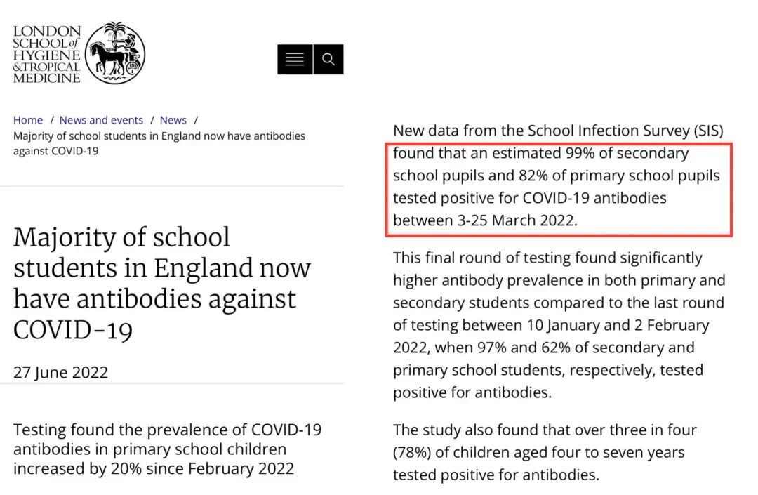 伦敦大学的一项追踪型研究显示,2022年3月3-25日期间,英国已经有99%的中学生和82%的小学生拥有新冠抗体。
