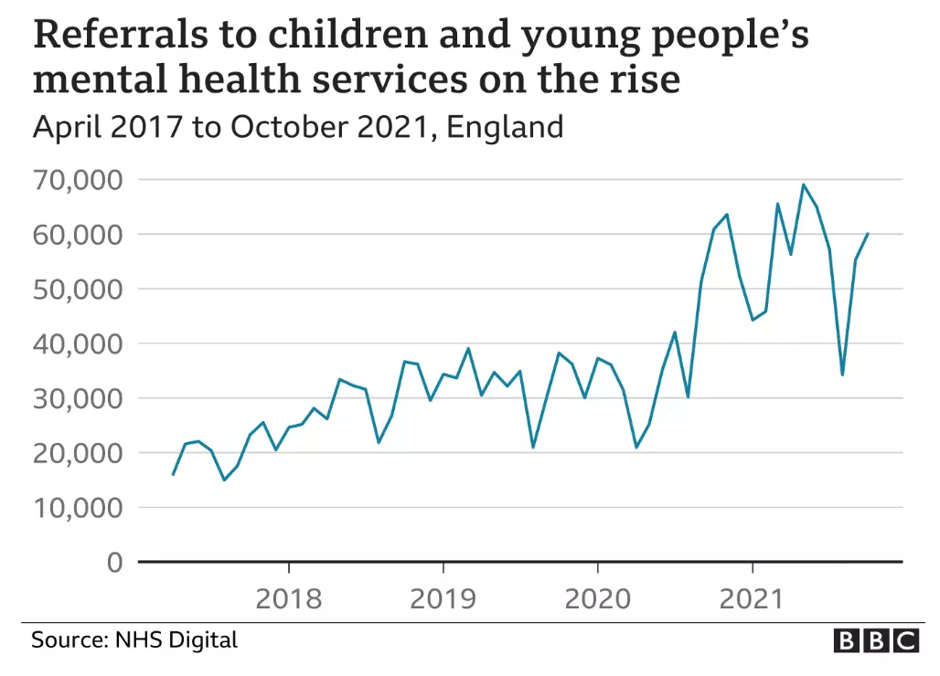 NHS数据:儿童心理健康问题在疫情后巨幅上涨