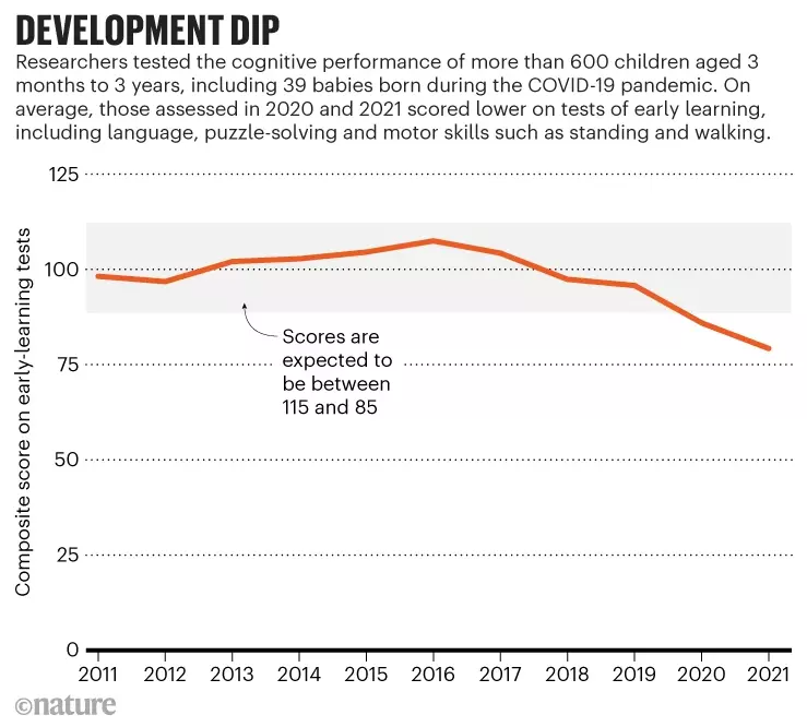 结果发现,其中39个疫情期间出生的孩子,在语言、解谜、精细动作等方面,比疫情前的同龄孩子得分低了近两个标准差。