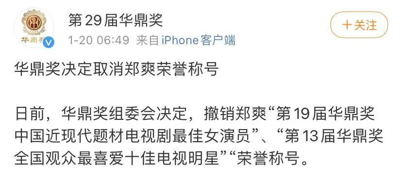 华鼎奖取消了郑爽的奖项。(她的演技居然能获得最佳女演员?!)