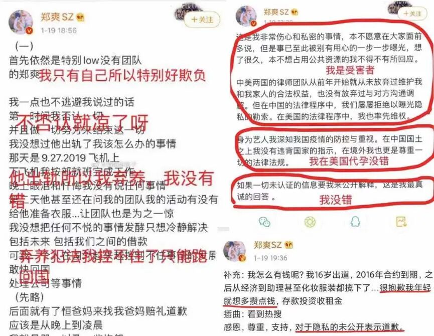 事情发酵以后,郑爽前后三次在微博回应,然而通篇没有看出任何对自己错误的认识,只是一味地推脱狡辩,仿佛她才是受害人。