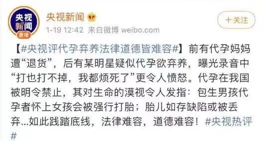 央视新闻点名批评代孕弃养的行为,称其“法律道德皆难容”。