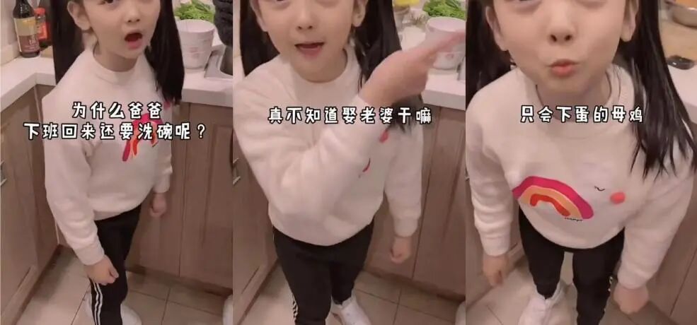 我之前无意中刷到一个视频,一个七八岁的小姑娘,借“给爸爸打抱不平”,咒骂自己的妈妈是“只会下蛋的母鸡”。