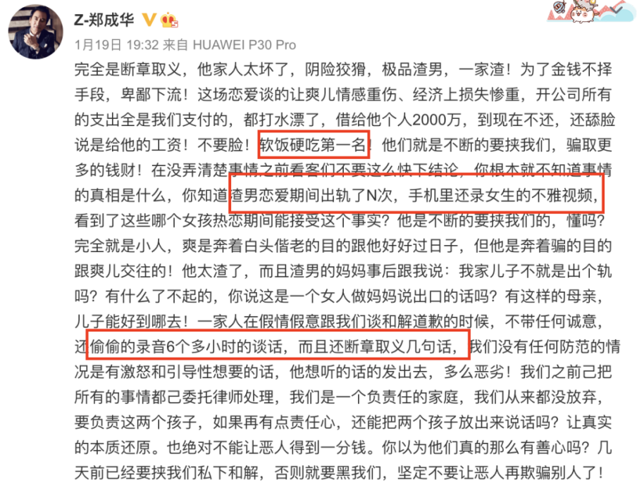 随后郑爽爸爸也发文辩解,称他们是“负责任的家庭”。是张恒这个“渣男”“欺骗、出轨、坑了他们家。”