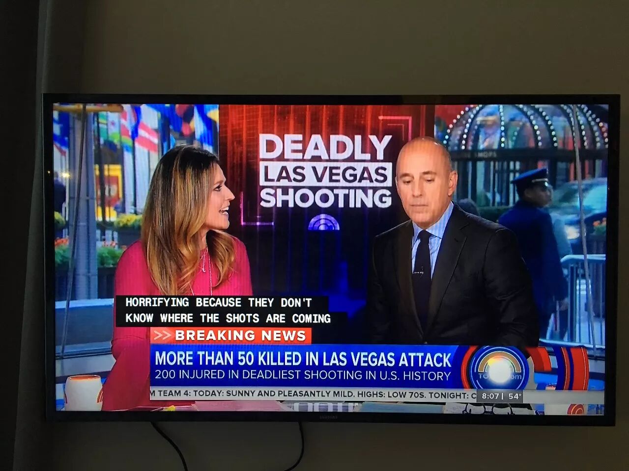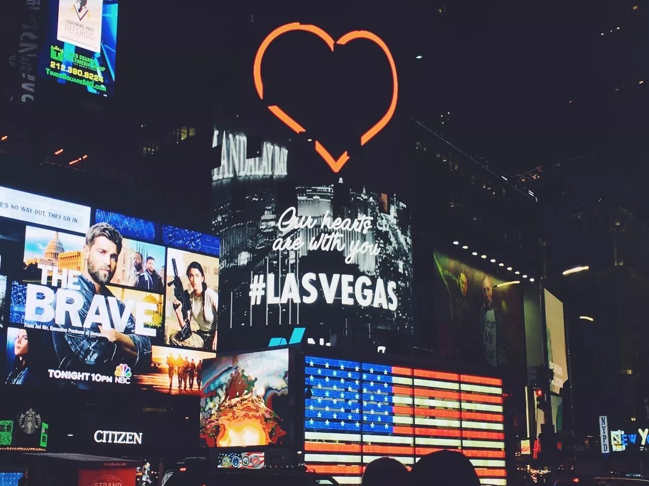 当天,有块大屏幕在为前一天发生在拉斯维加斯的恐怖事件遇难者悼念。意外无处不在,一定要珍惜当下的日子!