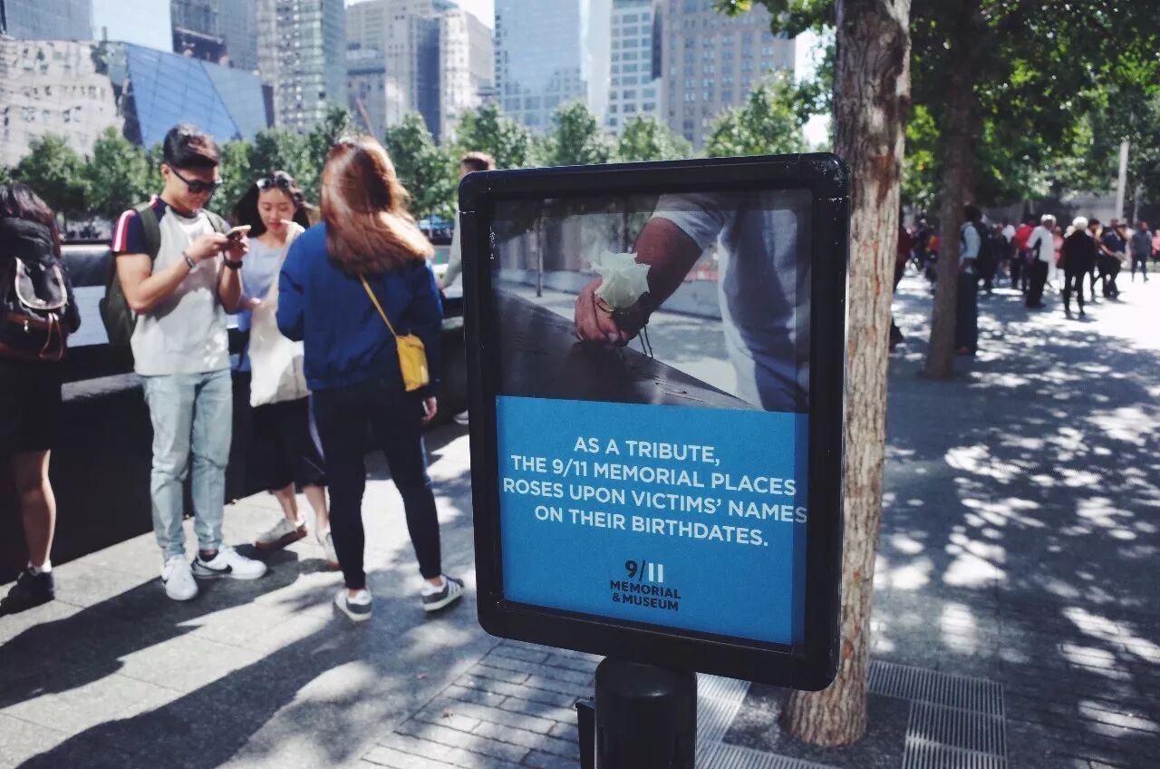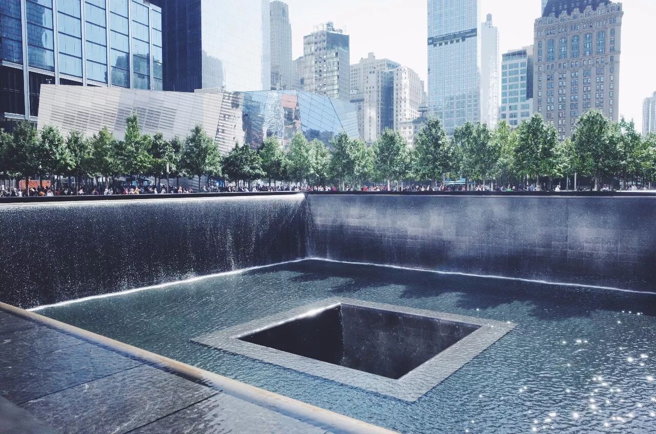 911纪念广场是美国人在被炸倒塌的双塔做了拆除,露出了大楼地基,做了向下30英尺跌落的大瀑布,围着纪念遗址走一圈,那些当天过生日的往生者,名字上会插上黄色或白色玫瑰花祭奠,911是面向平民的恐怖袭击,也是美国人民的民族仇恨,以这种流水的方式纪念,戳人心弦。