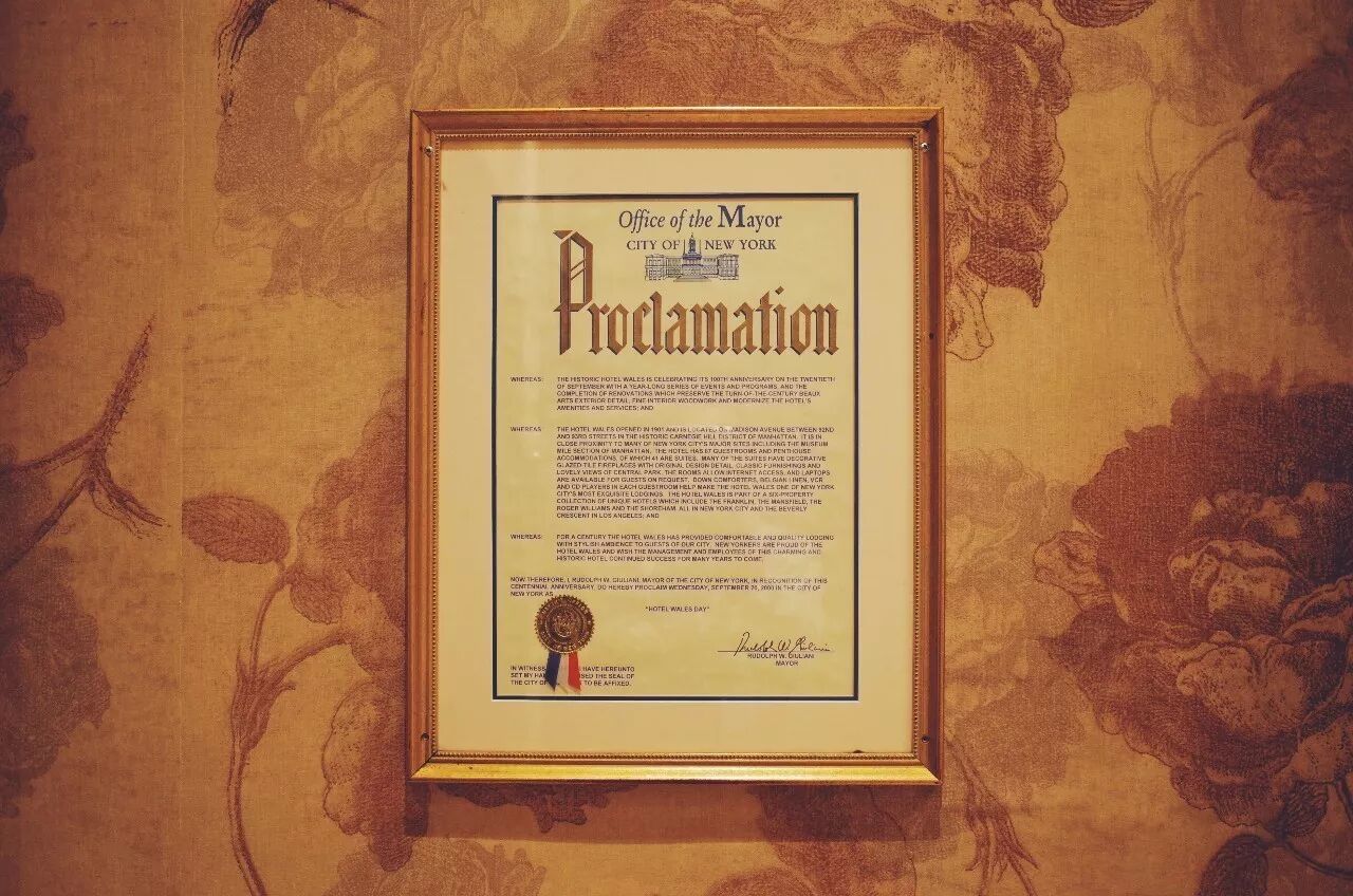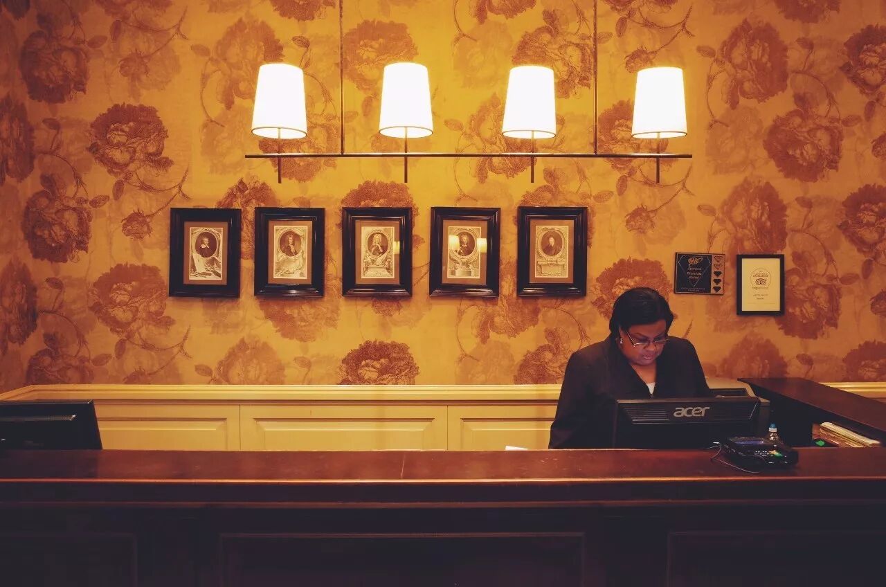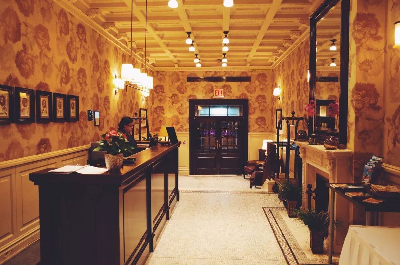 第二家酒店位于上东区,是一家很有年代感的酒店,叫威尔士酒店。酒店的前台装修的很复古,一米多高的乳白色包边,四周是威尔士传统的花纹图案,柜台和画框以及推拉门都是暗红色的木质材料,走进去就像驾驶着一辆老的奔驰车。大堂里还有一个壁炉,不知道再过些日子会不会真的生火?