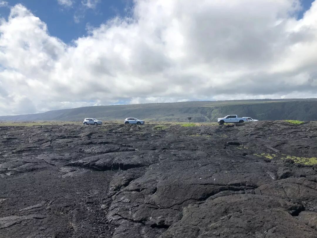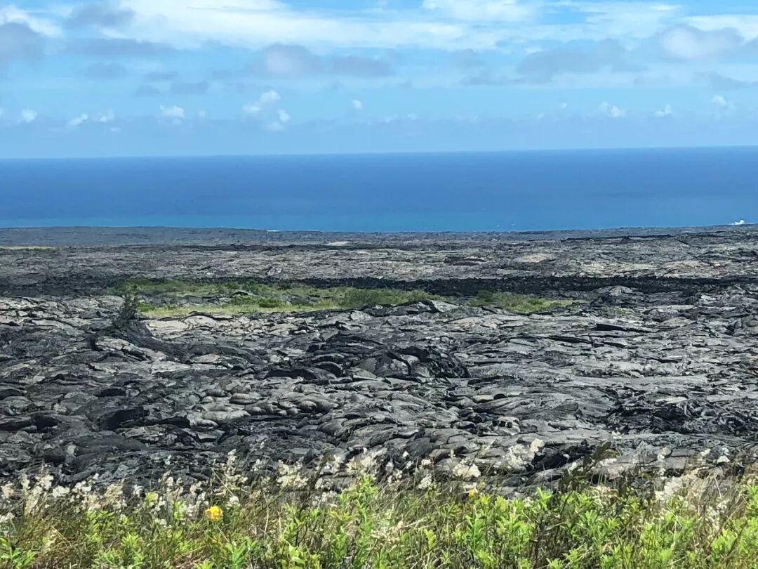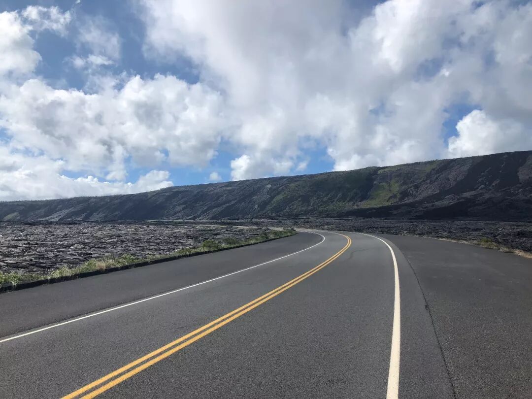 火山公园还有两条自驾道路,其中chain of craters rd可以开着车一路到海边,这也是一条熔岩奔腾而下的线路,沿途是不同年份喷发的火山口和熔岩,近看像是燃烧不充分的煤炭,踩上去像玻璃渣子那样扎脚。广阔山海间的巨大熔岩太适合拍杂志大片了。