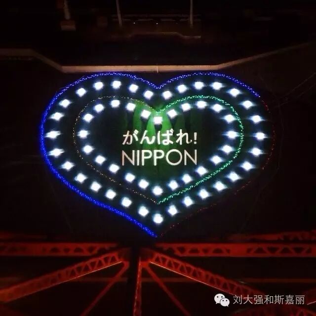 东京铁塔下面的草坪布置成了“日本 加油”的造型