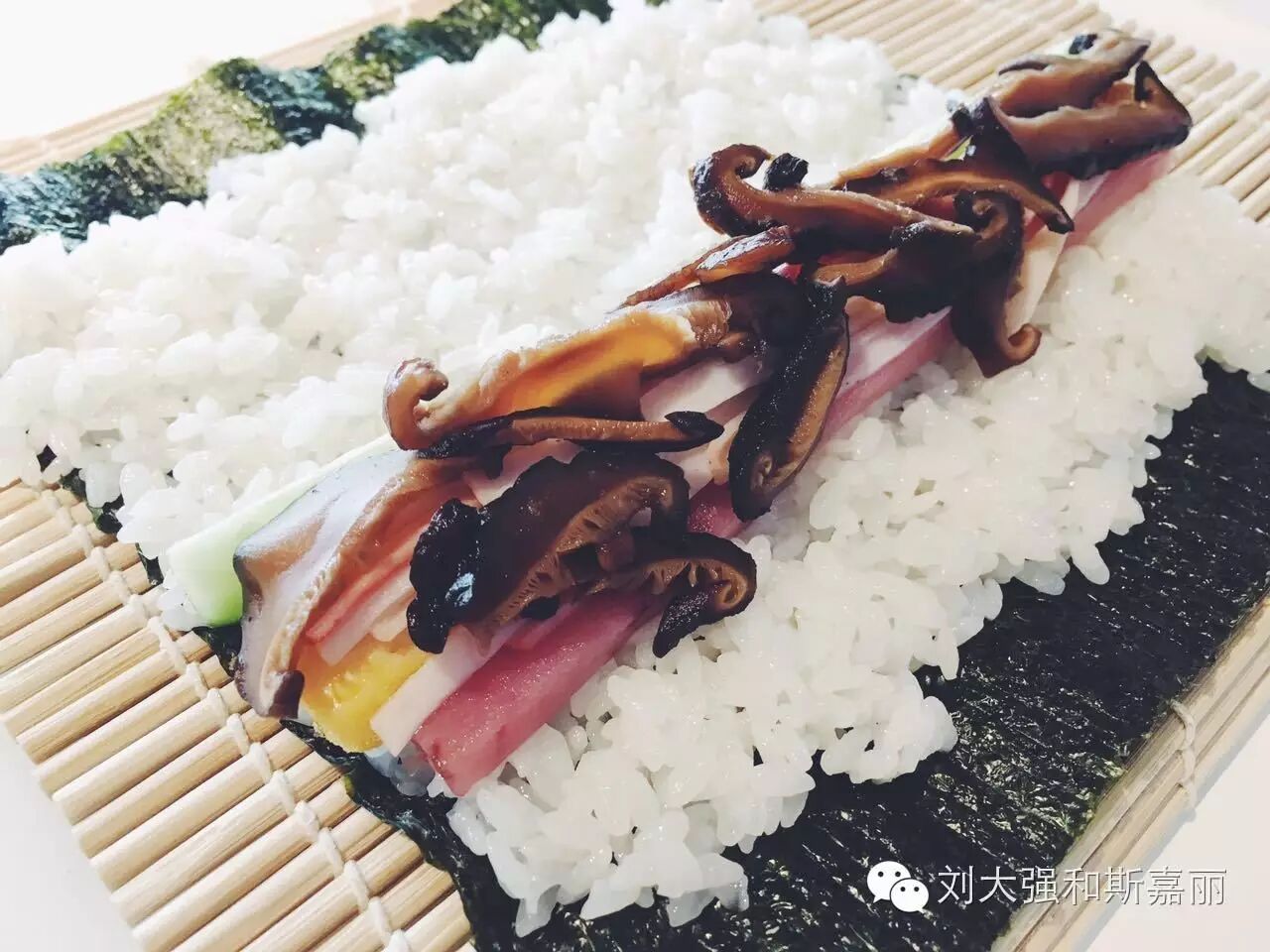 将寿司卷竹摊开,拿一块紫菜铺在上面,让紫菜的纹理顺着要卷的方向。取备好的米饭摊平在紫菜上,上下各留1-2厘米的空隙。然后将备好的黄瓜条、蟹肉棒、玉子烧条、香菇丝放在米饭上面,以竹卷托住米饭把菜都卷起来,用力压紧,调整竹卷再向中间卷,直到卷完。注意力度要适中,太轻了容易散,太重了又会挤破紫菜,最后将寿司卷切成1-2厘米的小卷,切寿司的时候米饭会粘刀,记得沾点寿司醋就好了。
