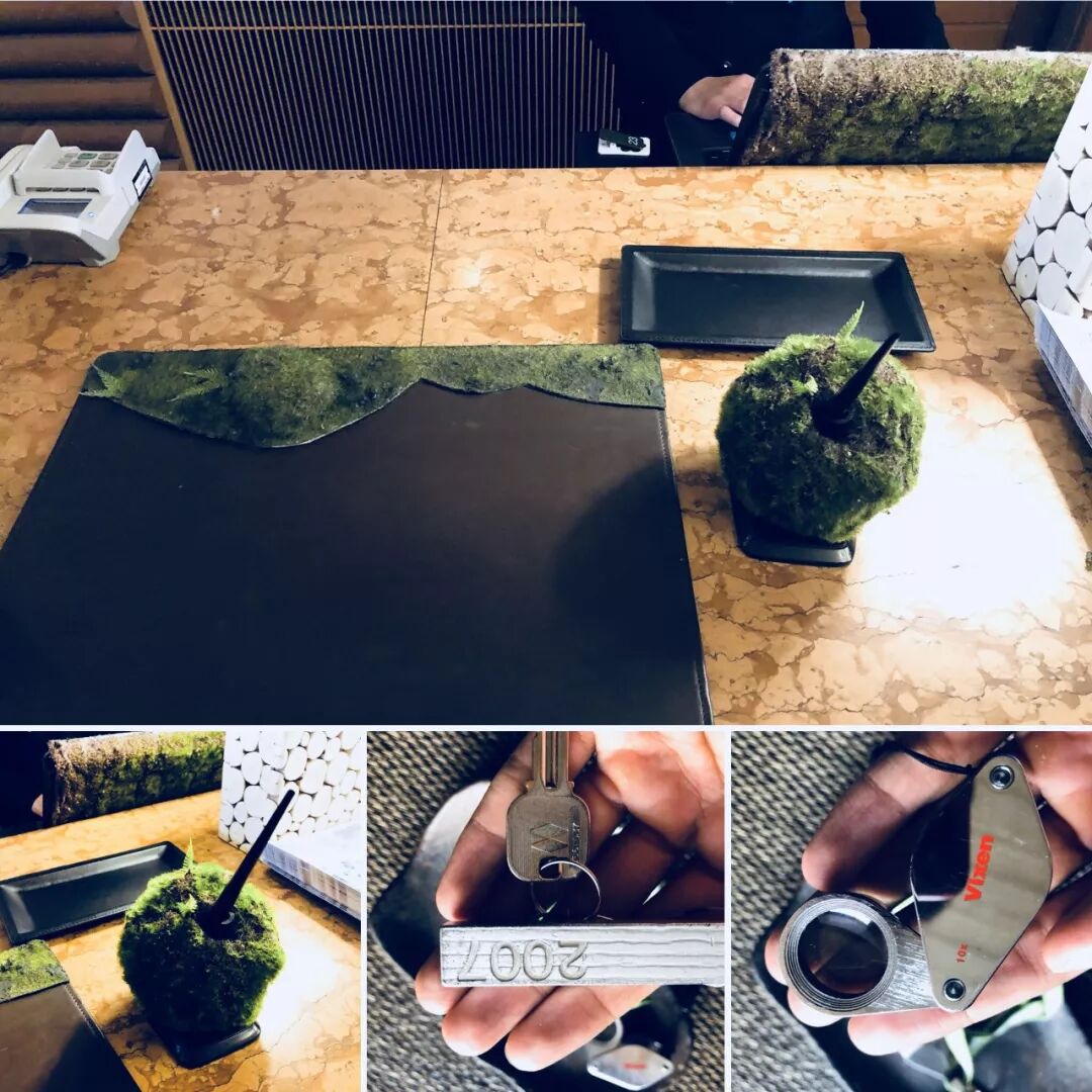酒店前台设计中处处可以体现出苔藓的元素,不论是插笔的笔筒,还是签字的写字板,还是工作人员电脑的封皮都长满了苔藓,是真的苔藓哦~