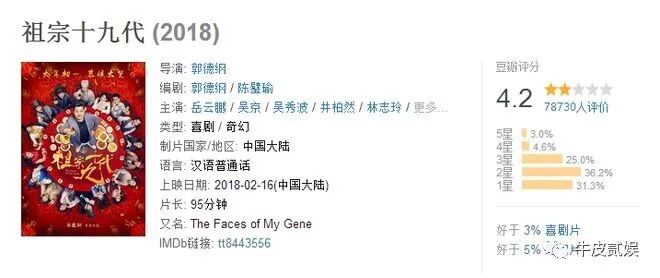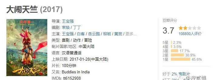 比如2010年“快乐家庭”和徐峥主演的《嘻游记》评分3.3分,2009年他客串过的《熊猫大侠》评分4.4分,《齐天大圣前传》评分2.3分,2016年客串的《大话西游3》评分4.0分。