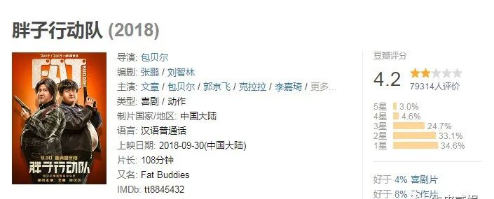 除了这部戏,包贝尔的电影处女作《胖子行动队》的评分也很低,目前是4.2,也获得了金扫帚奖。