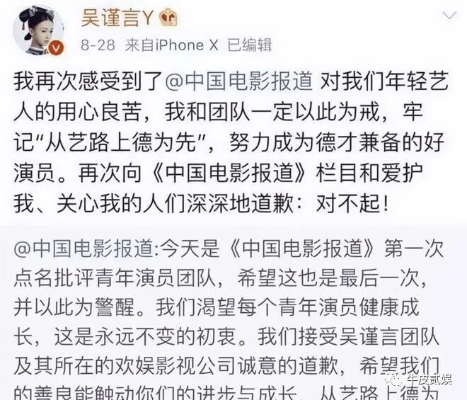 结束采访后就在社交平台点名批评吴谨言的团队,并且告诫所有青年演员:从艺路上任重道远,德为先。