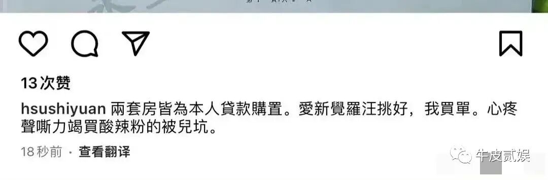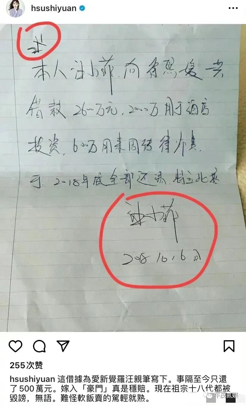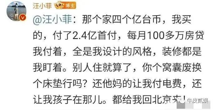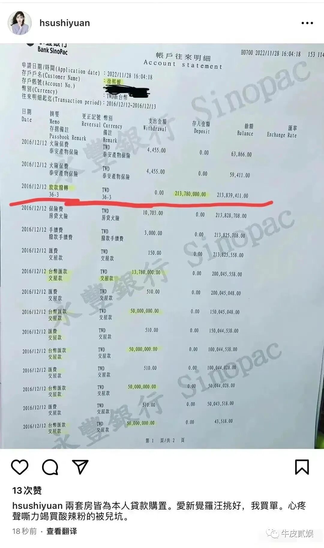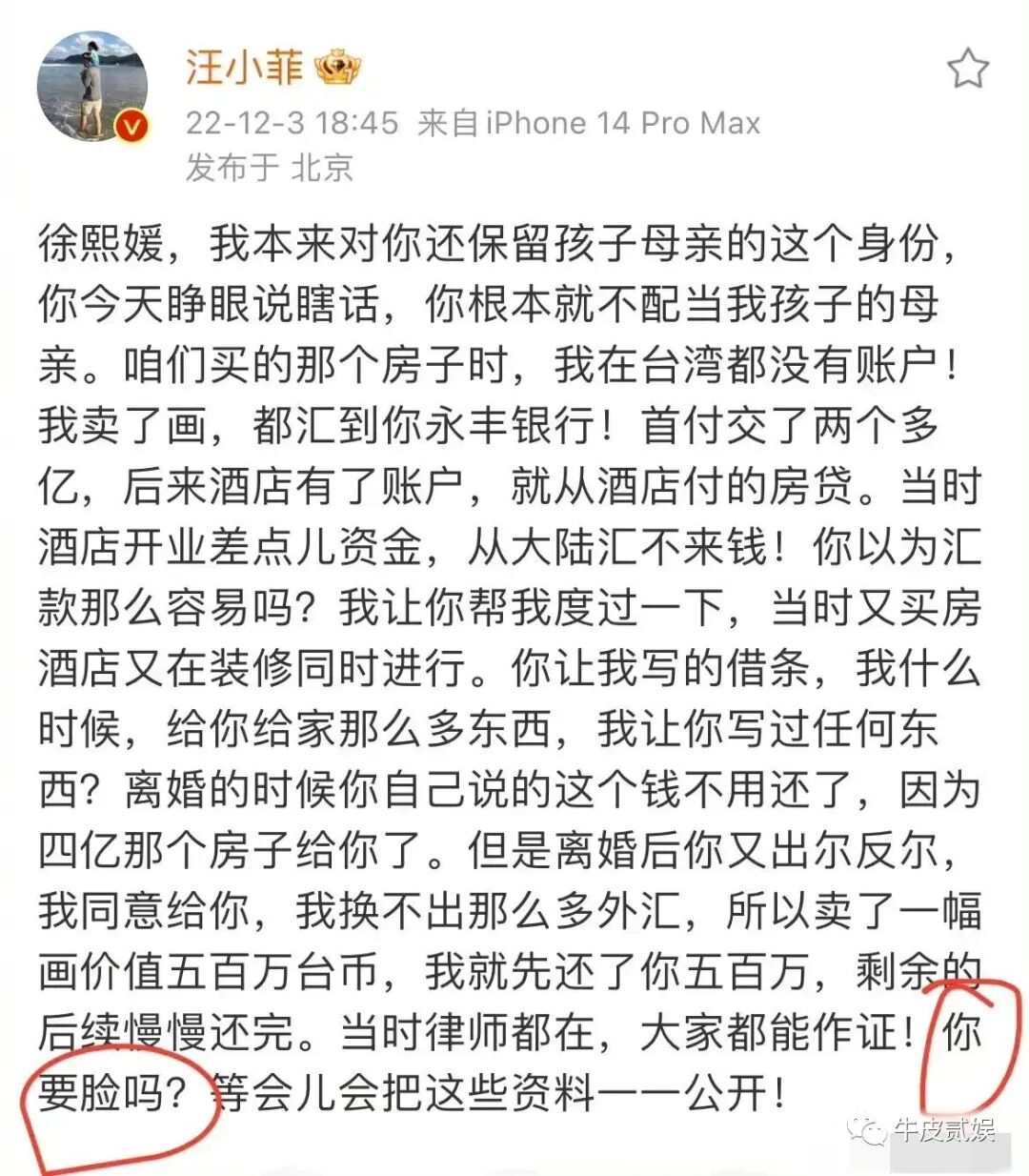 徐熙媛,我本来对你还保留孩子母亲的这个身份,你今天睁眼说瞎话,你根本就不配当我孩子的母亲。咱们买的那个房子时,我在台湾都没有账户!我卖了画,都汇到你永丰银行!首付交了两个多亿,后来酒店有了账户,就从酒店付的房贷。当时酒店开业差点儿资金,从大陆汇不来钱!你以为汇款那么容易吗?我让你帮我度过一下,当时又买房酒店又在装修同时进行。你让我写的借条,我什么时候,给你给家那么多东西,我让你写过任何东西?离婚的时候你自己说的这个钱不用还了,因为四亿那个房子给你了。但是离婚后你又出尔反尔,我同意给你,我换不出那么多外汇,所以卖了一幅画价值五百万台币,我就先还了你五百万,剩余的后续慢慢还完。当时律师都在,大家都能作证!你要脸吗?等会儿会把这些资料一一公开!