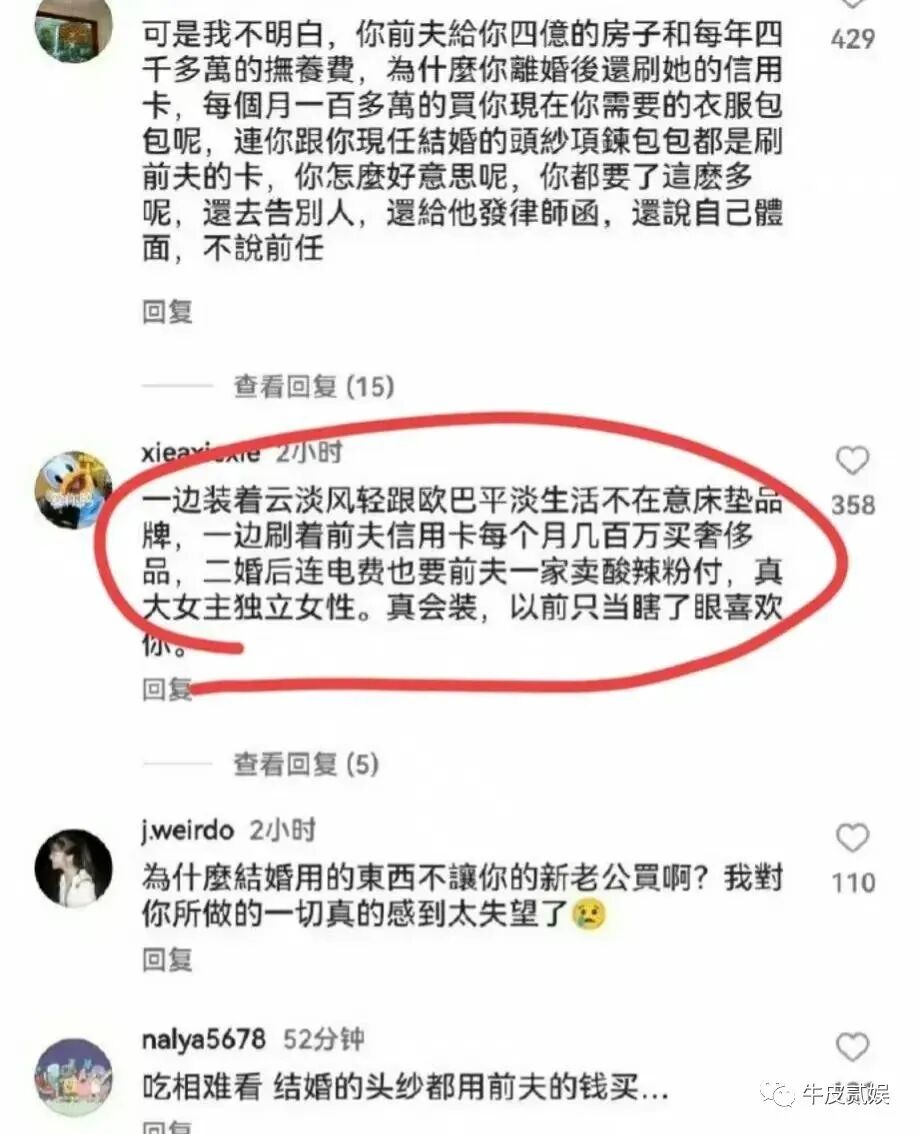 一边装着云淡风轻跟欧巴平淡生活不在意床垫,一边刷着前夫信用卡每个月几百万买奢侈品,真会装。