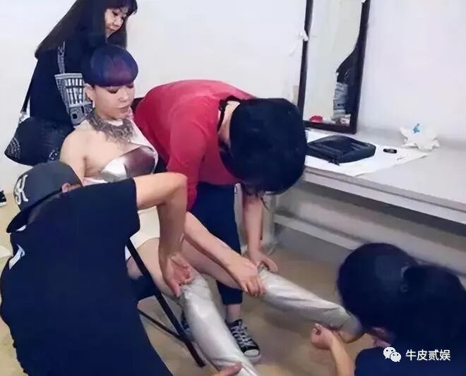 还有吴莫愁,作为某晚会嘉宾,上场前她光是穿鞋就要用到四个工作人员。