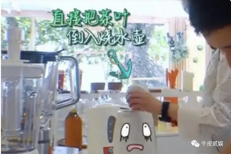 打开壶盖后,周冬雨再现惊人操作,直接把茶叶往水壶里倒,泡茶变成了煮茶。