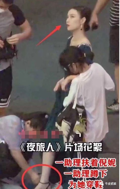 《夜旅人》拍摄现场,倪妮被狗仔抓拍,可能是刚拍完一场戏需要换装,只见她身边马上跑过去两位助理,一个搀扶着倪妮,另一个跪下去亲手解带侍寝。