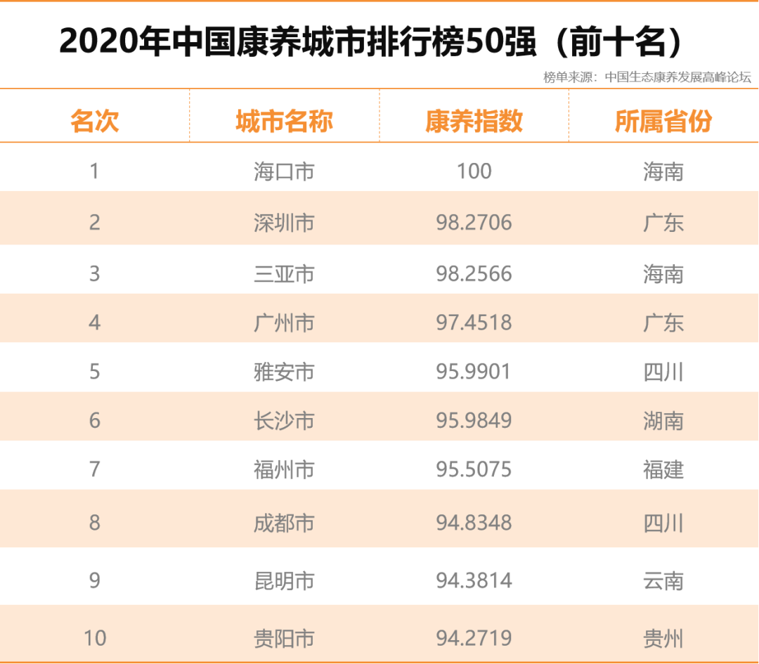 开始之前,我们先看个榜单:今年3月,“2020年中国康养城市排行榜50强”名单公布,其中海口、三亚位列1、3名。该榜单根据生态环境、医疗资源、产业融合、民生幸福和康养政策等综合指标进行评选。