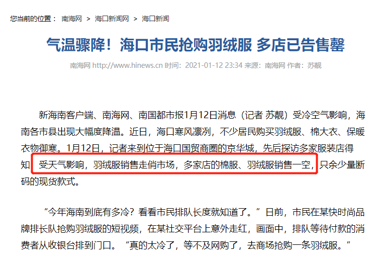 楼Sir查到,早在今年1月,海口市民就因气温骤降抢购羽绒服,据当时的淘宝数据显示,海口网友羽绒服下单量环比增加了306%。