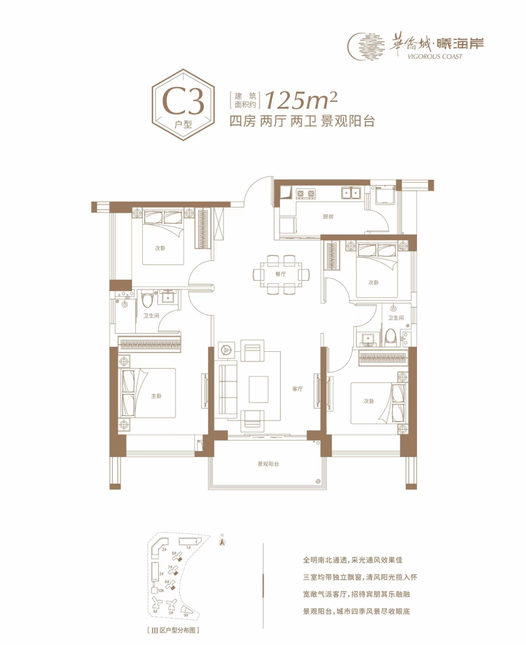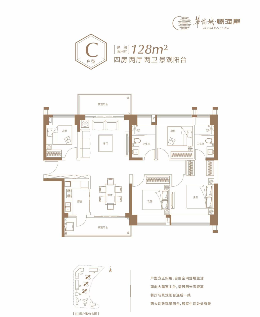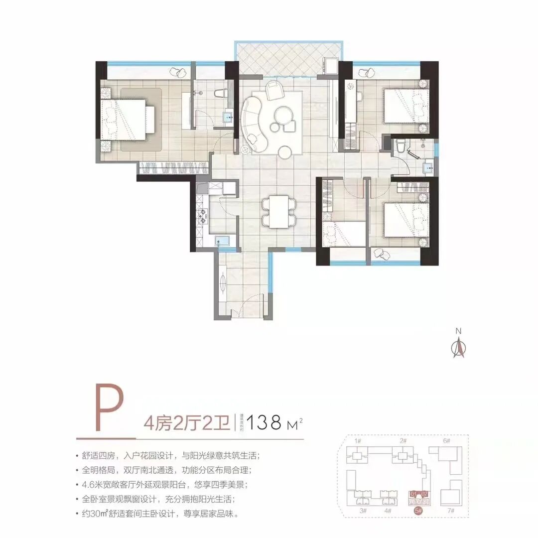 目前三期6#在售产品户型共有两种:125㎡和128㎡的四居室。2梯3户,总楼层23层。先看户型图: