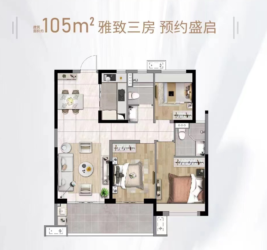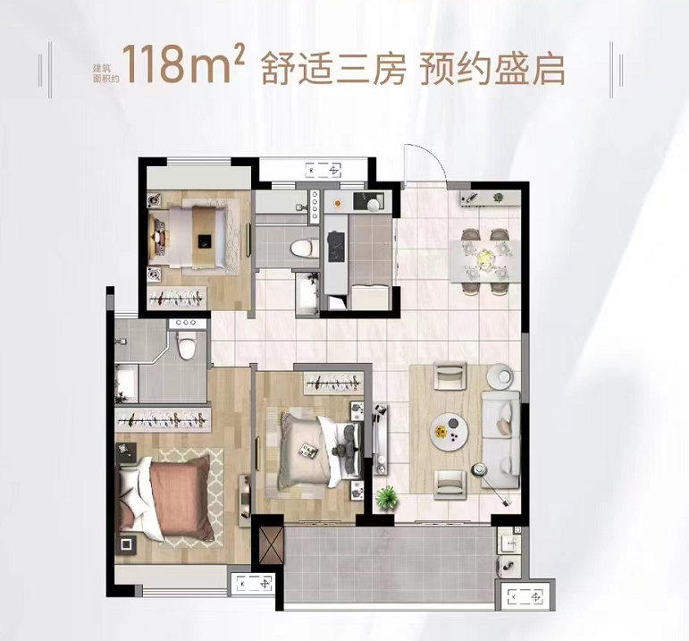 2梯4户板楼,层高26层,主力户型为105㎡和118㎡(仅有50套)的三居室。户型图如下: