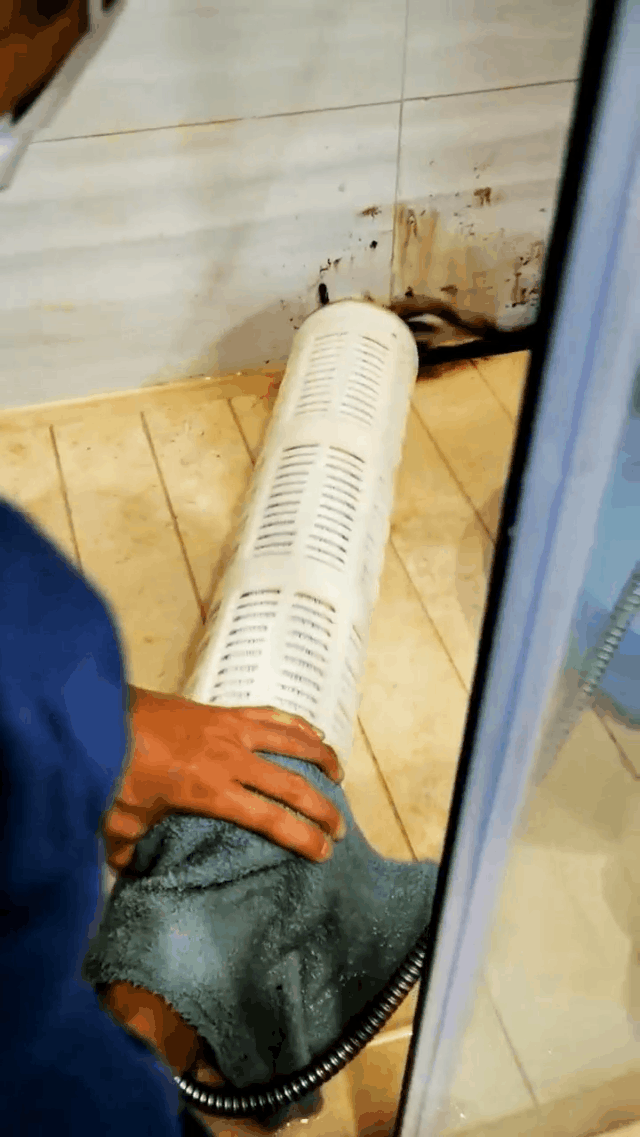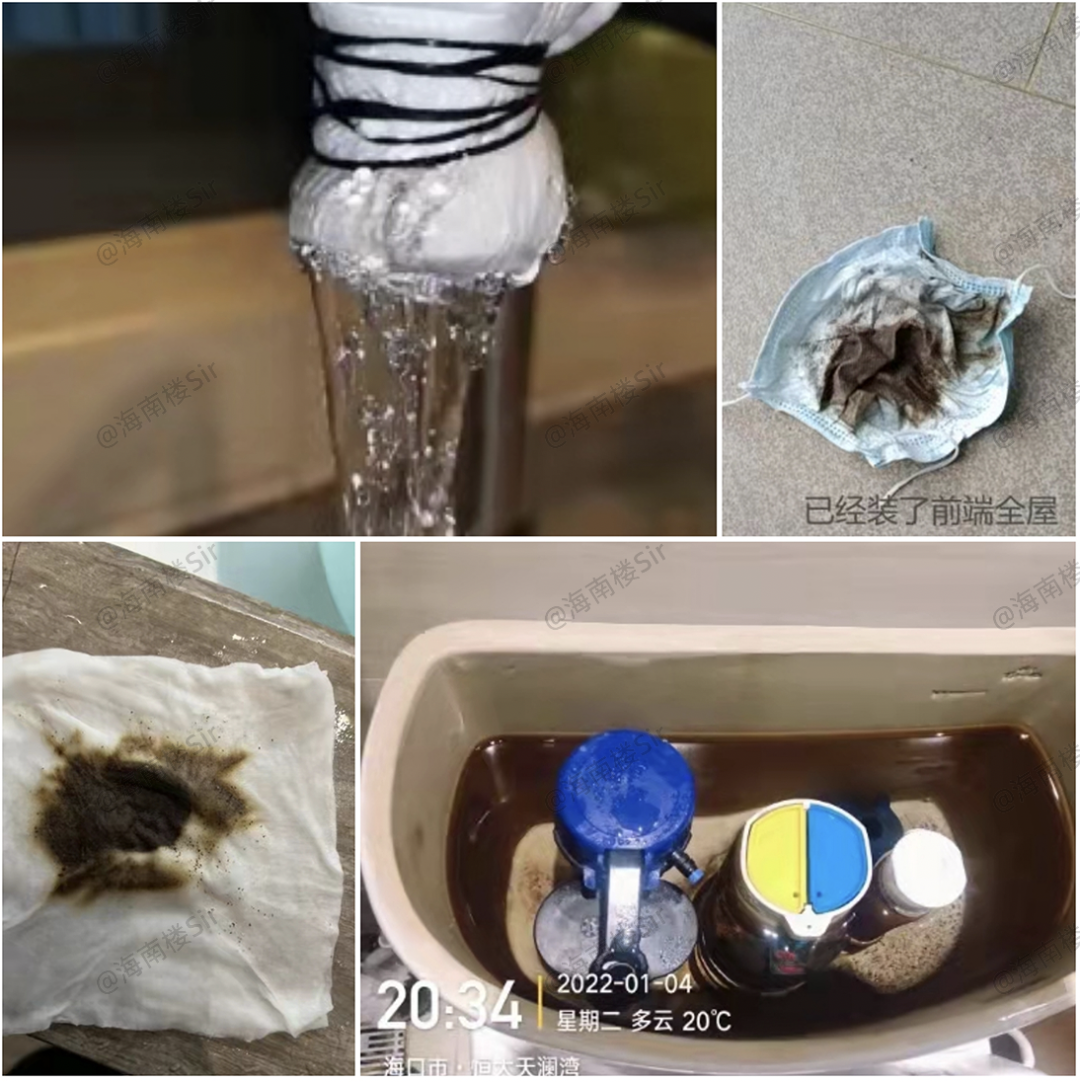 但是,肉眼可见,业主家里的过滤芯、马桶蓄水池里都有很厚的水垢,甚至于用口罩套在水龙头上用两天,就能黑一片。